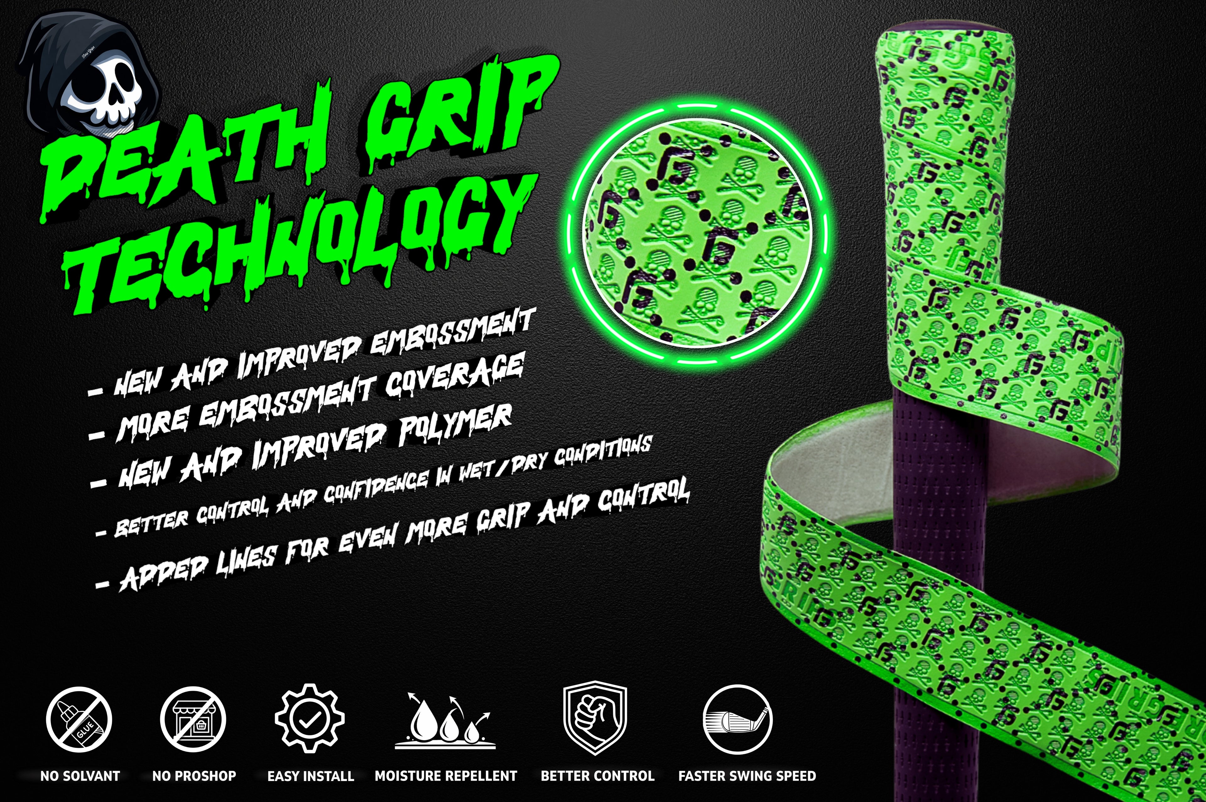 Death Grip Technology™ features our all-new reformulated polymer that boosts tackiness, durability, and total club control without losing that clean wrap-and-play feel you love.